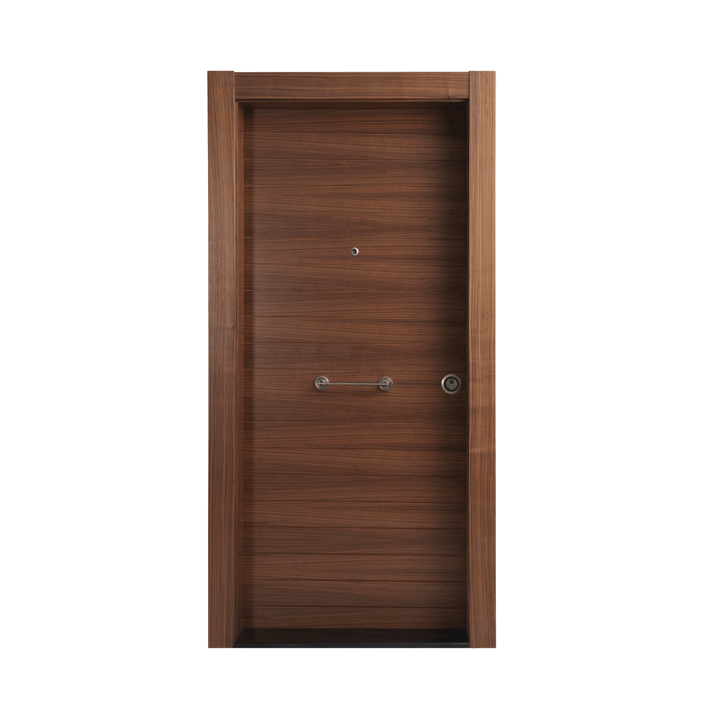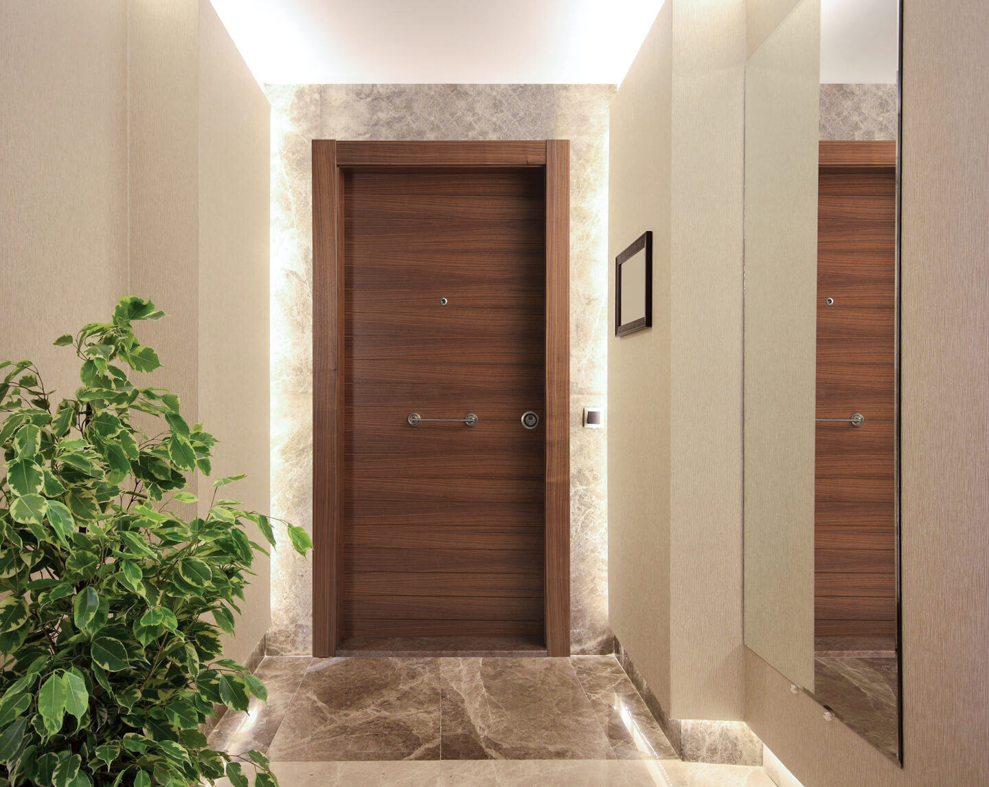 Suitable for condominiums and hotel rooms, our exterior Wood Veneer doors have a 4mm steel interior frame with MDF panels and a natural wood veneer from a choice of either mahogany, walnut or oak. • We manufacture 2 types of exterior door – the standard swing door and pivot doors. • Our exterior doors come with a 4mm interior frame. • Our exterior doors are prehung (are attached to a jam with hinges when they arrive from our factory) and are pre-drilled. • Our exterior doors have a 2 year warranty and 5 year warranty on the multi-lock system. • All our exterior doors come with a double-layered sound and dust sealing gasket. • We offer door installation services.