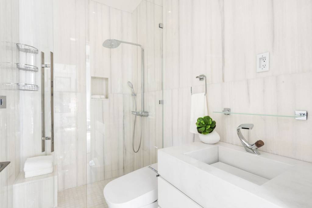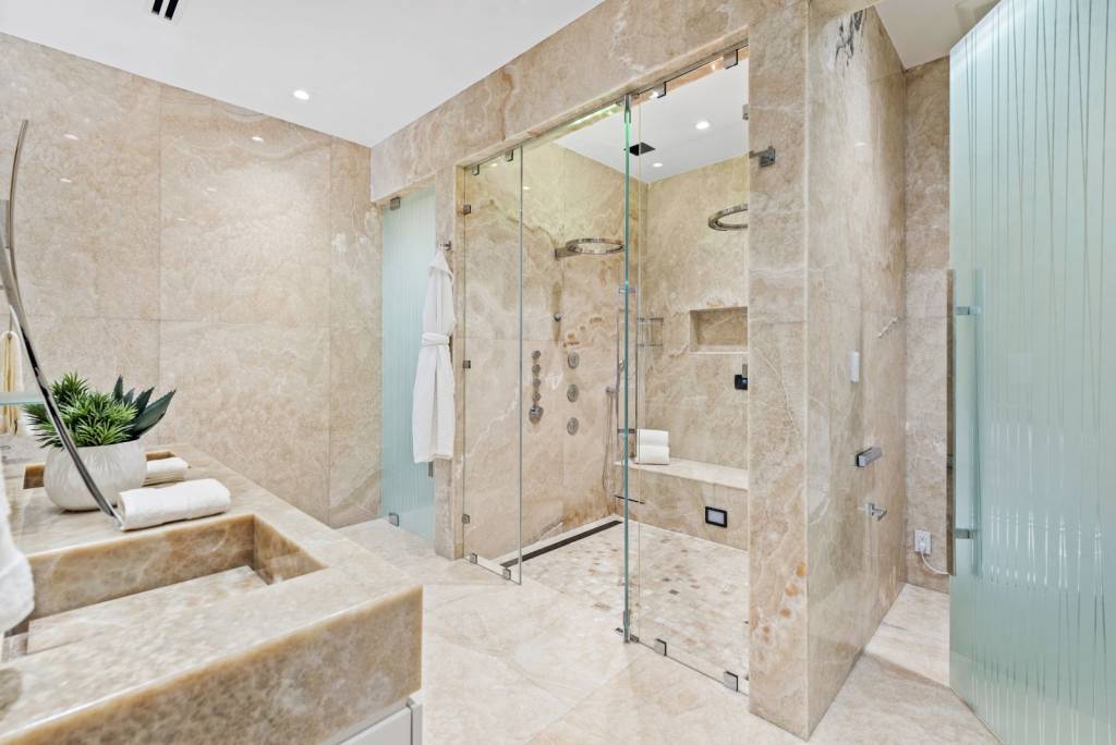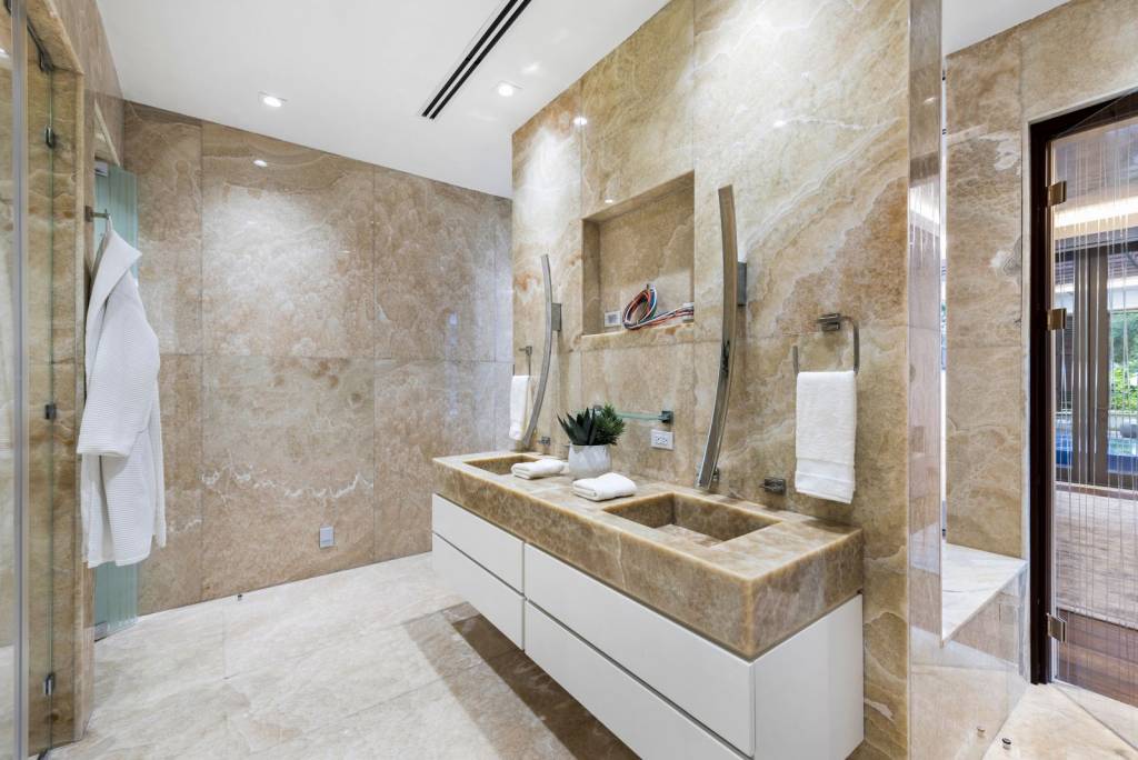 • Floating lacquered bathroom vanities with onyx countertops and integrated sinks