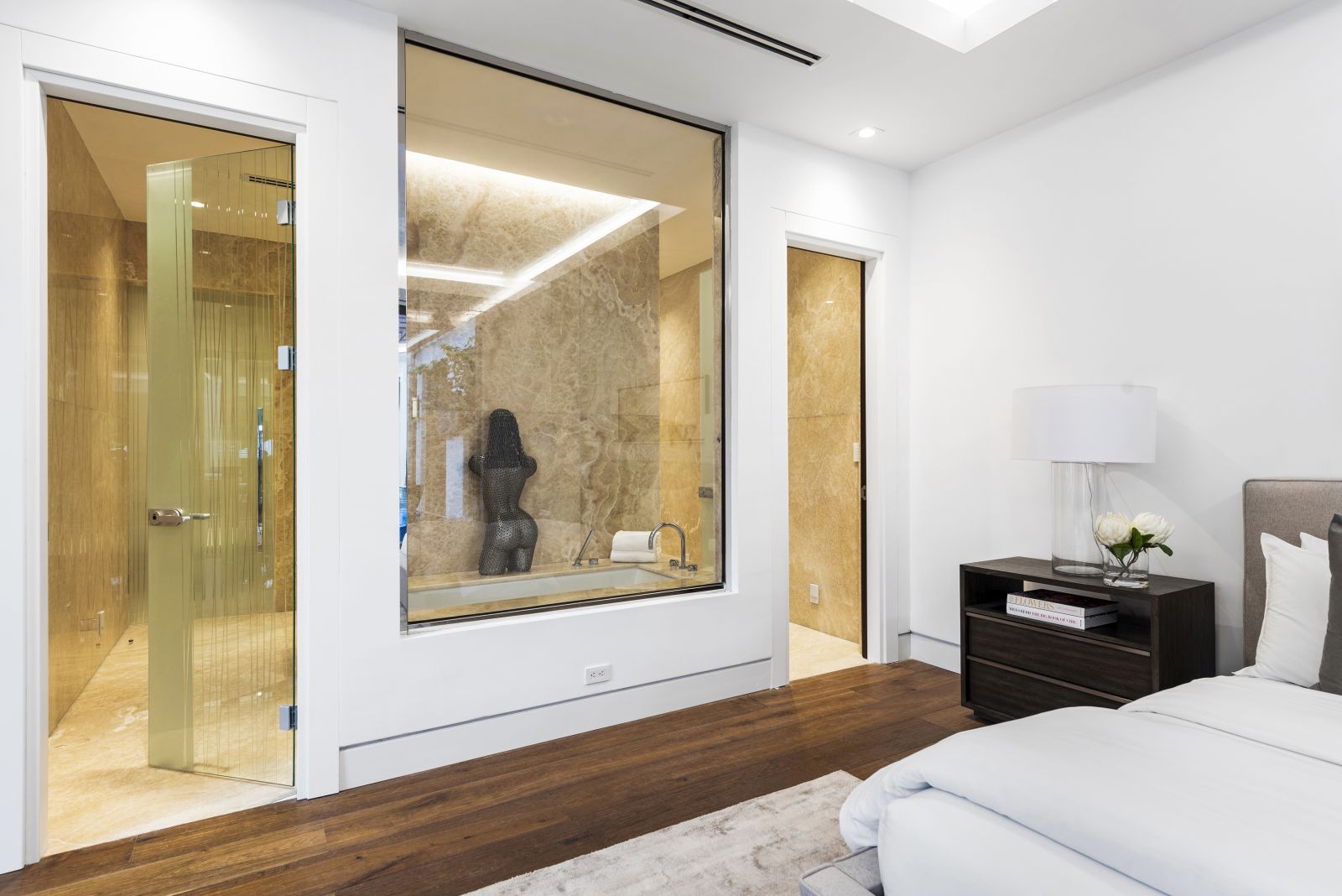 • Floor-to-ceiling lacquered wall panels with concealed hidden door system for a seamless architectural finish