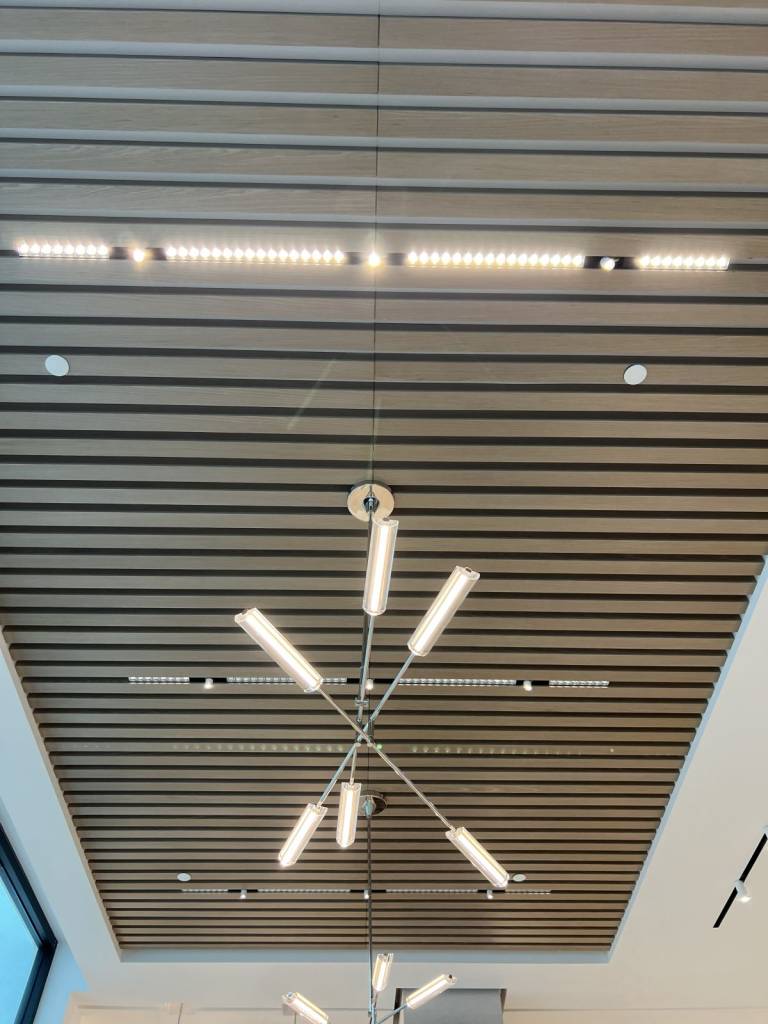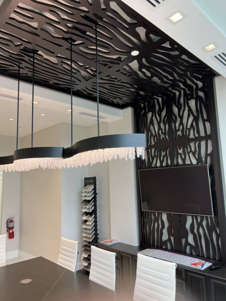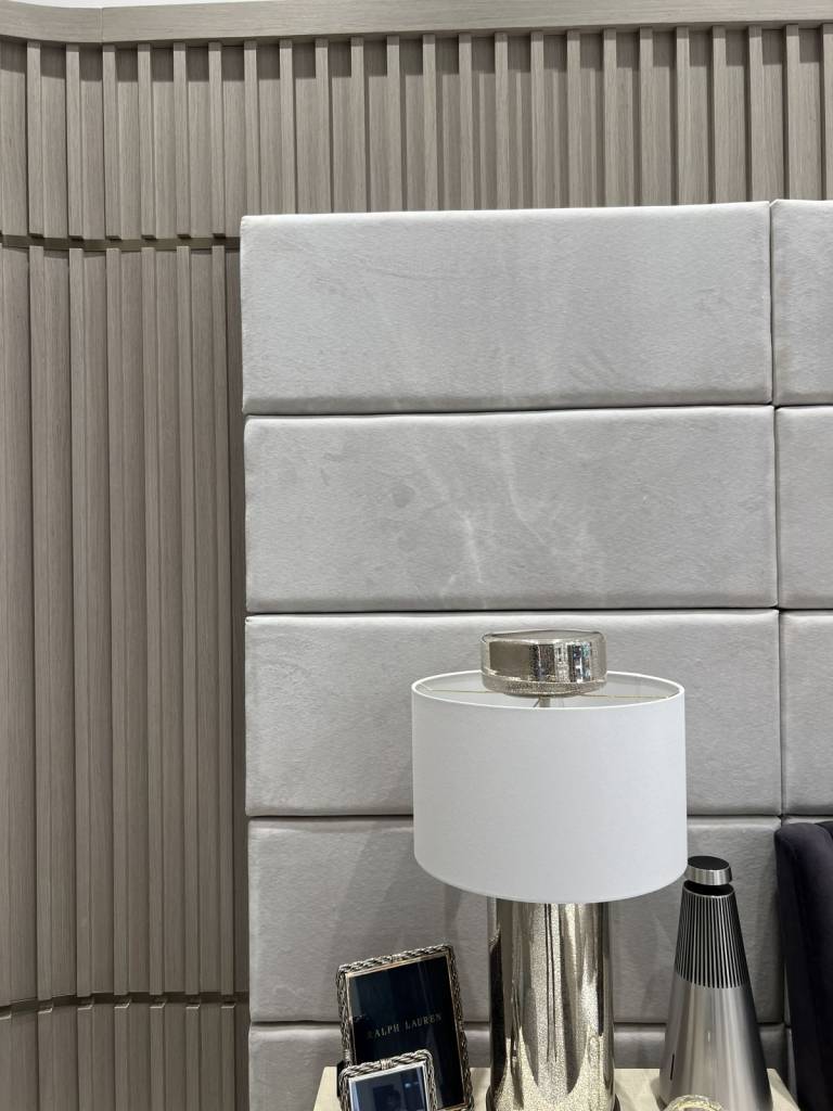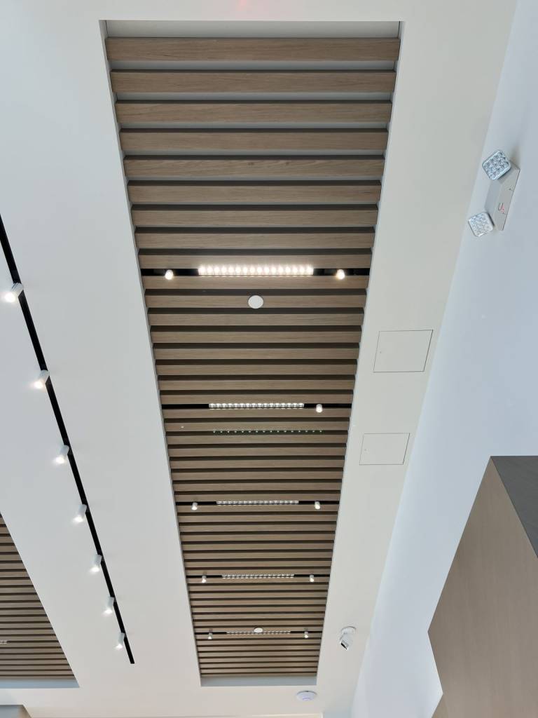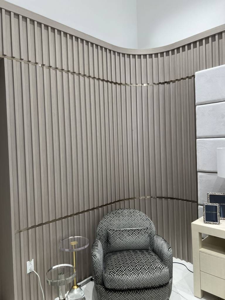 A cohesive palette of grey oak, black oak, and platinum finishes defines the showroom, with rift cut veneers and slatted detailing creating rhythm and texture throughout. Curved ribbed wall panels soften the geometry of the space, while CNC-cut feature elements and layered ceiling designs introduce depth and visual interest.