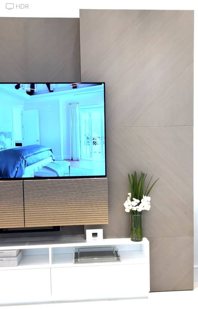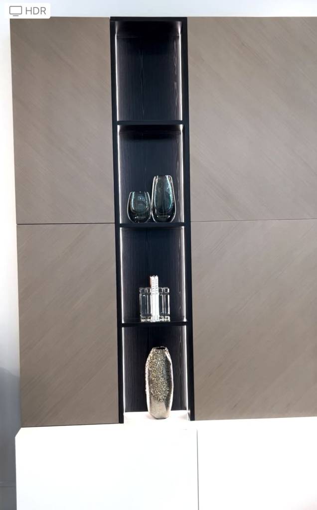 - Wall unit in rift cut grey Oak, whitened black Oak, and high gloss lacquer