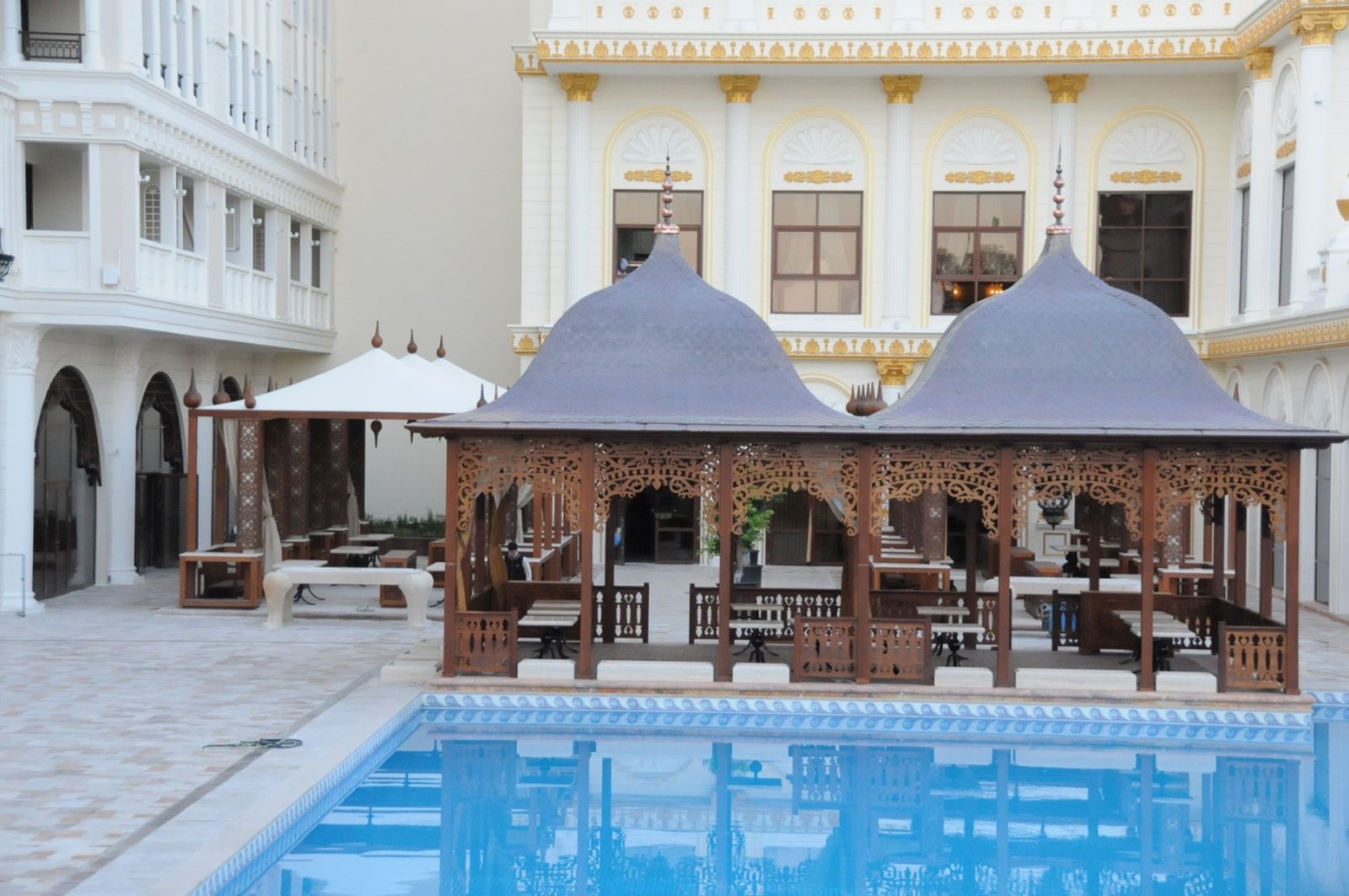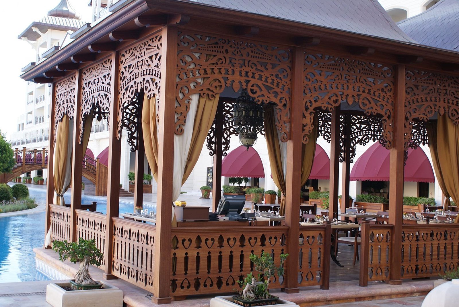 Custom pergolas fabricated from solid Iroko with intricate CNC detailing